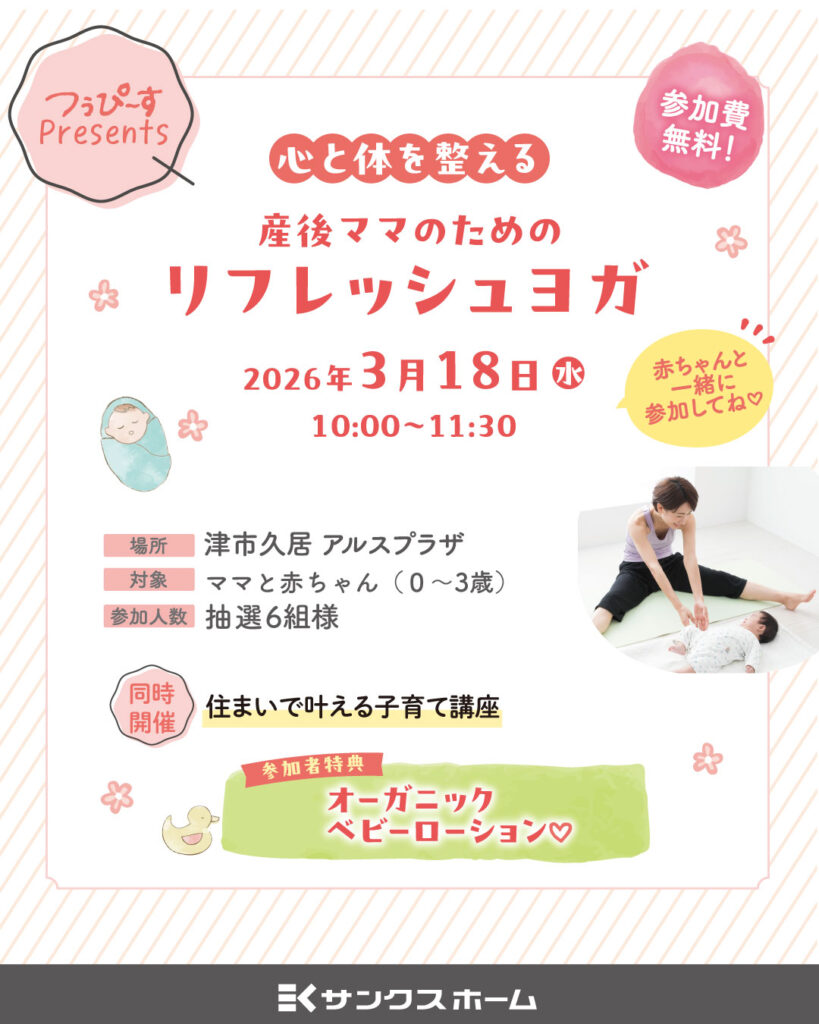 【3/18】つぅぴ~すpresents!心と体を整える産後ママのためのリフレッシュヨガ&知育環境づくりセミナー同時開催〈津市〉