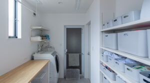 使う場所の近くに必要な収納を配置し、“出しっぱなし”を防ぐ工夫。家族みんなが無理なく片付けられる仕組みが整っています。